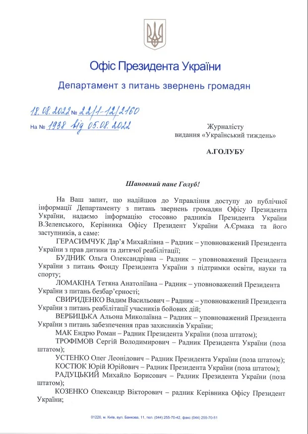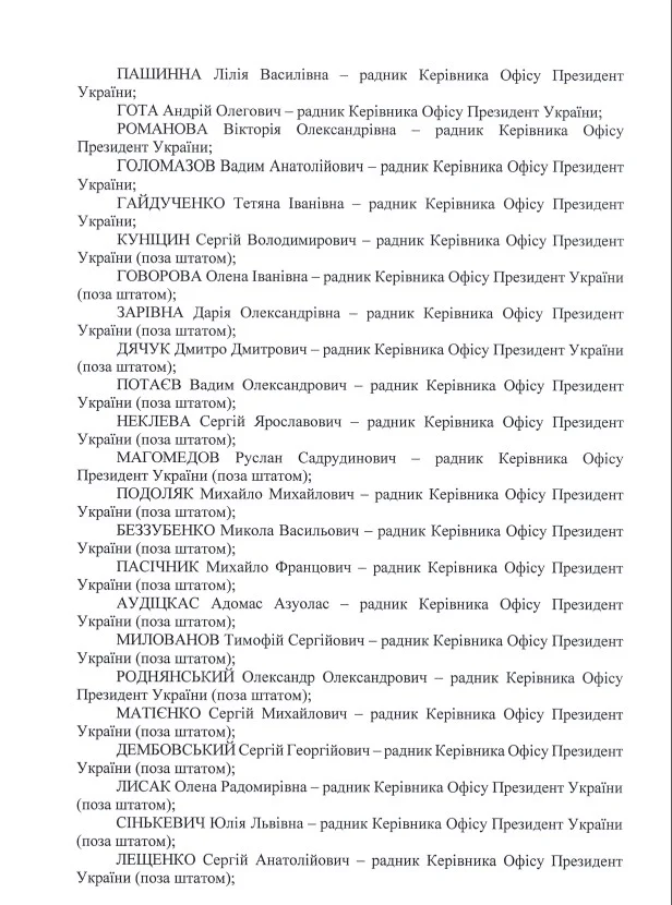 Про це свідчить перелік радників Офісу президентаУкраїни, який надали у відповідь на запит видання “Український тиждень”.