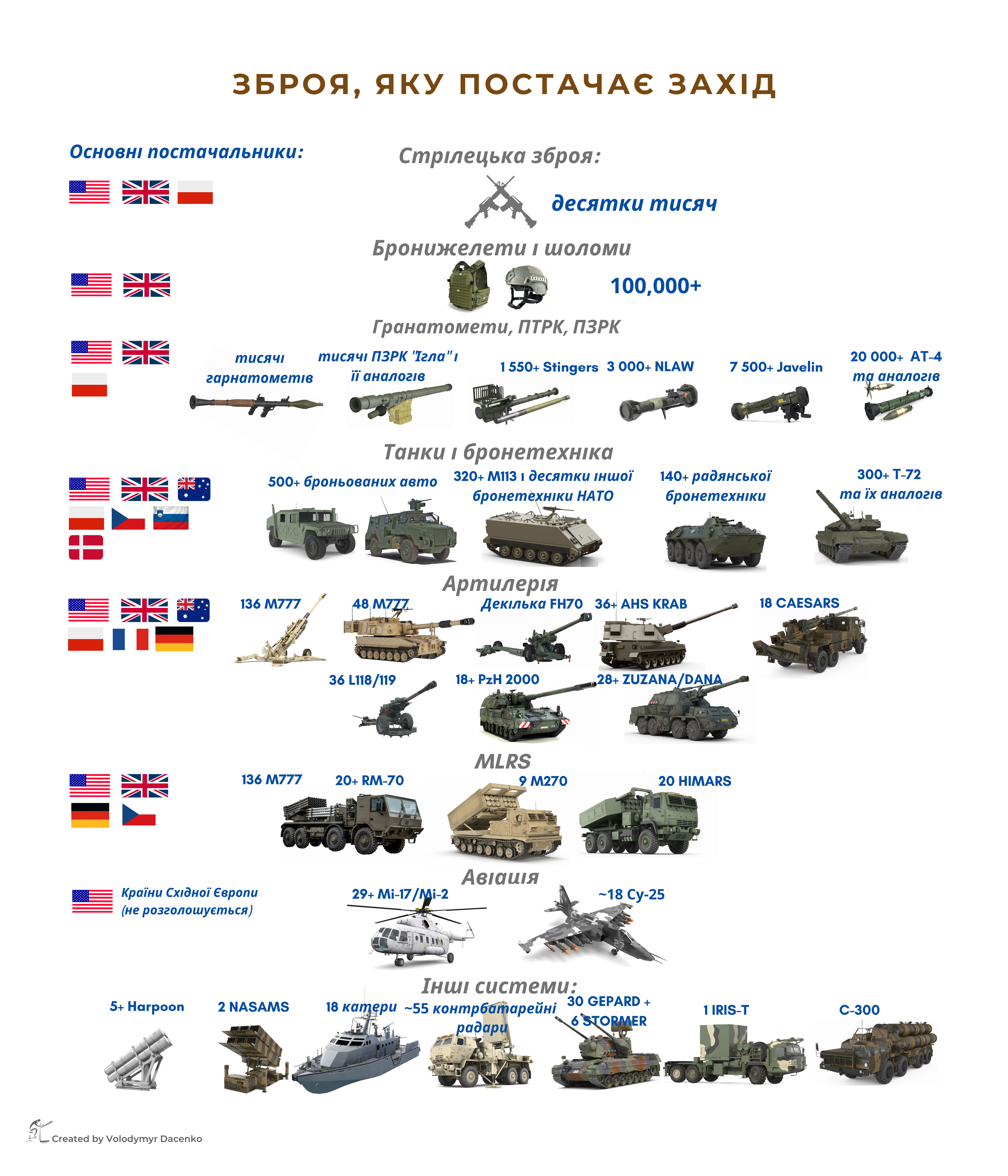 Щомісяця поставки натівської зброї в Україну змінювалися за кількістю та класифікацією. Все почалося з партизанської зброї, зараз же Україна сподівається отримати ракети ATACAMS, що б’ють на 300 км в тил ворогу.