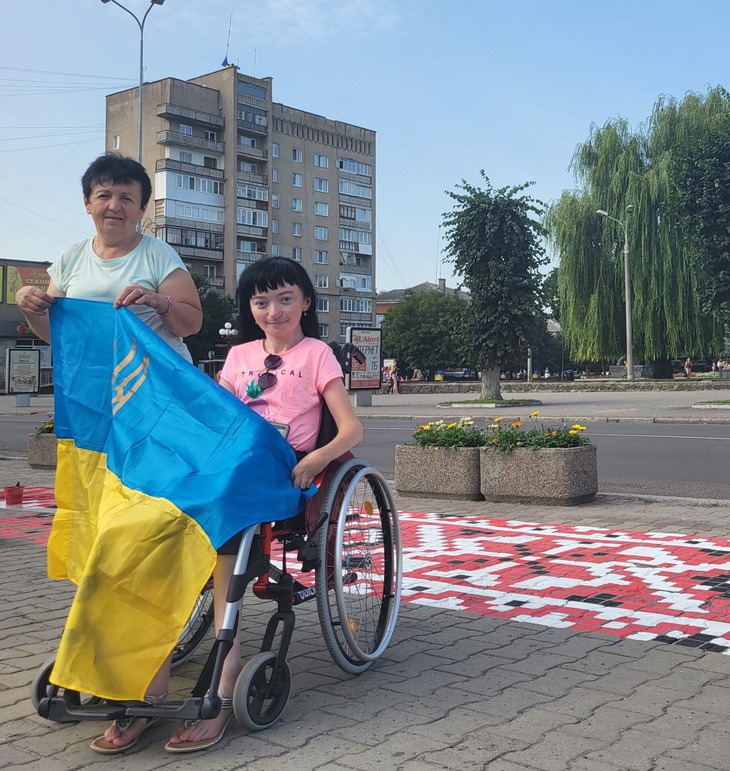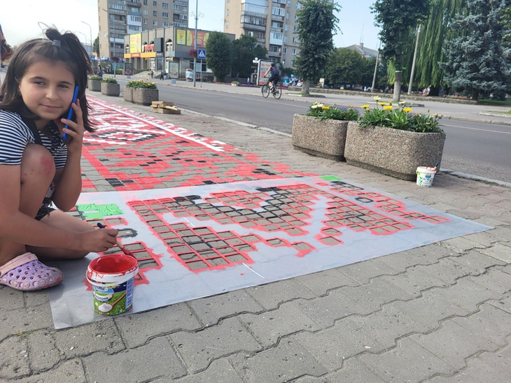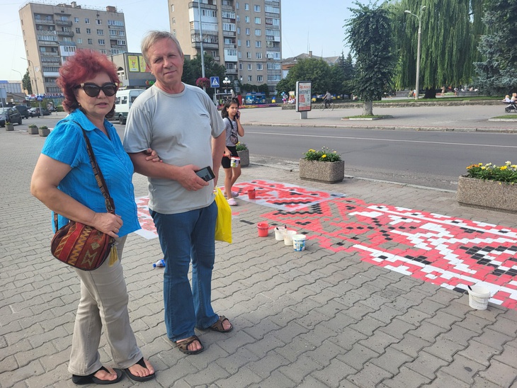 Ковельчани підходять і милуються роботою художників, роблять фото. Оля Яренчук з мамою під’їхали подивитись на зміни, які відбуваються у центральній частині міста. Вони сьогодні з Державним Прапором України.