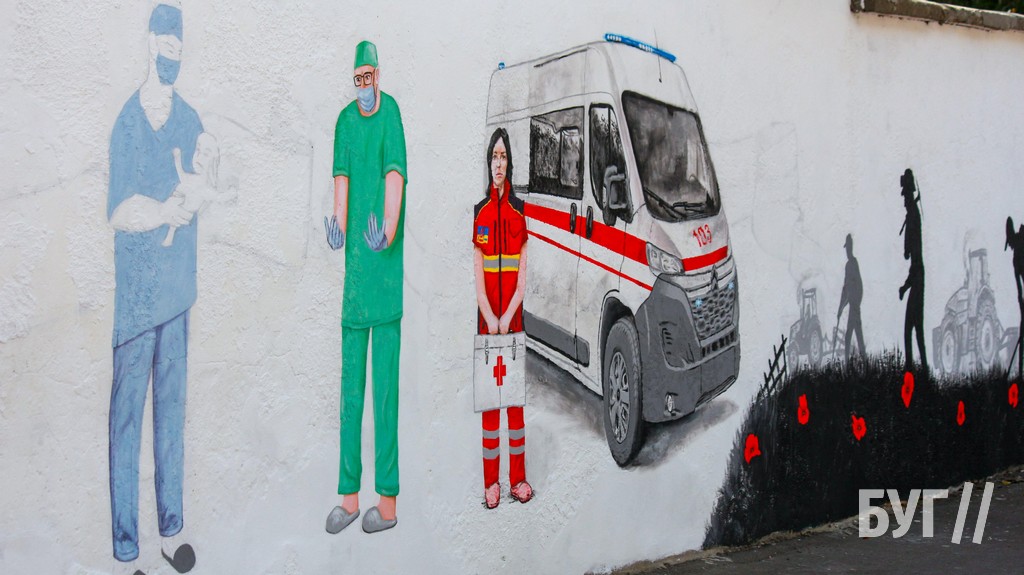 Хлопці завершили малювати фельдшера та карету швидкої допомоги, залишилось закінчити роботу над зображенням акушера та хірурга. Навколо головних постатей – фермери та ЗСУ на тлі поля маків.