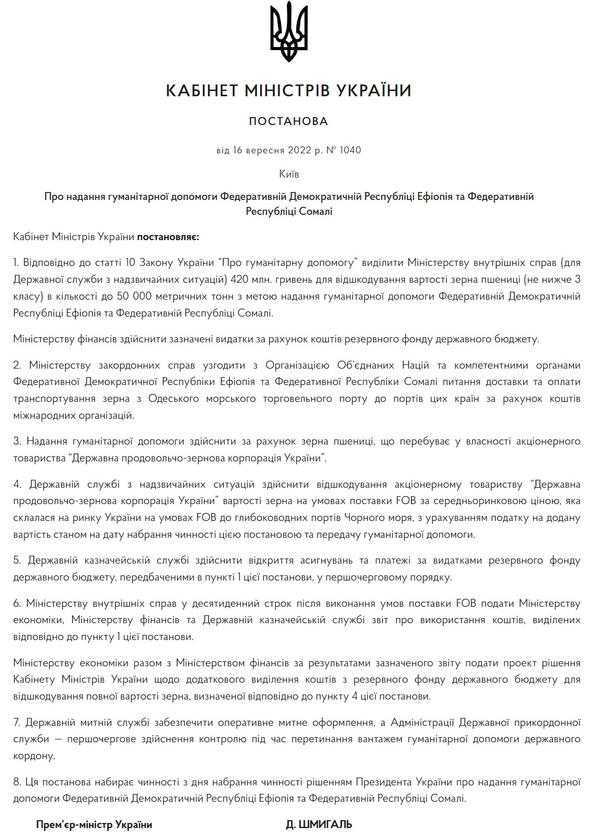 «Відповідно до статті 10 Закону України “Про гуманітарну допомогу” виділити Міністерству внутрішніх справ (для Державної служби з надзвичайних ситуацій) 420 мільйонів гривень для відшкодування вартості зерна пшениці (не нижче 3 класу) в кількості до 50 000 метричних тонн з метою надання гуманітарної допомоги Федеративній Демократичній Республіці Ефіопія та Федеративній Республіці Сомалі», – йдеться у повідомленні.