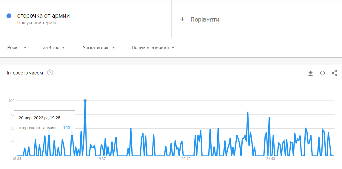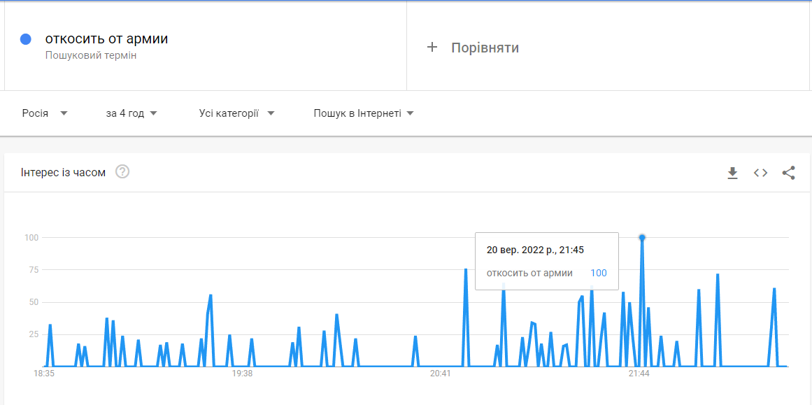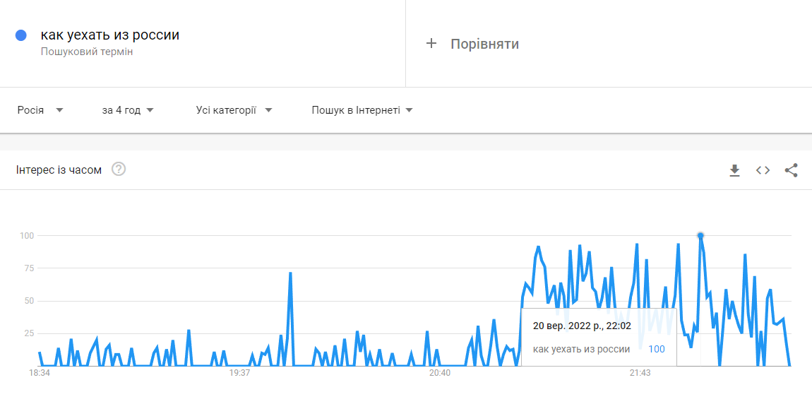 Увечері 20 вересня індекс запитів у Google за словосполученням «як виїхати з Росії» досяг максимуму.