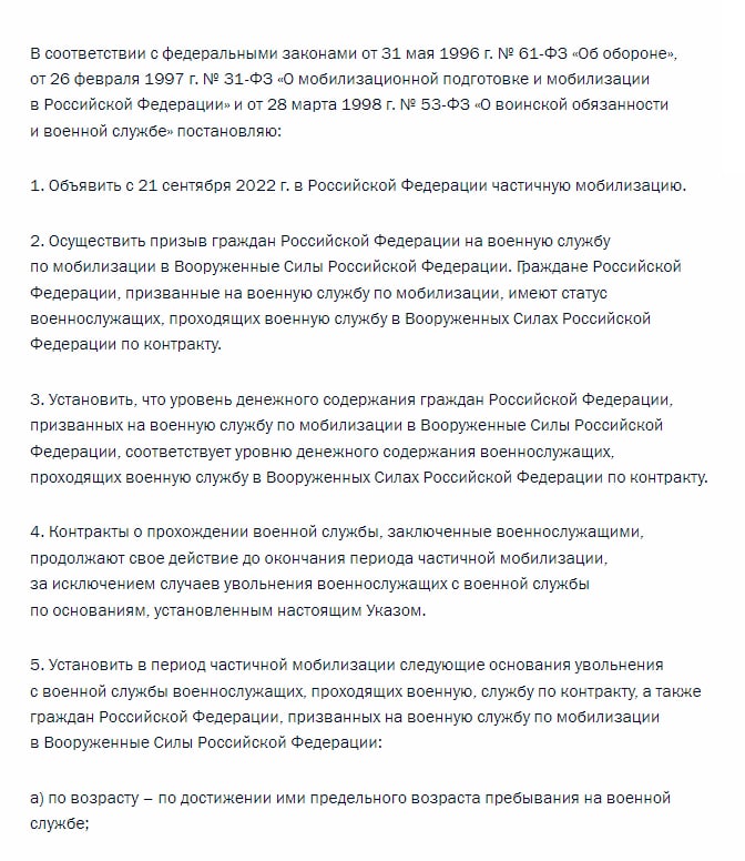 "Для захисту росії, її суверенітету і цілісності вважаю за необхідне підтримати пропозицію про проведення часткової мобілізації", – сказав путін.