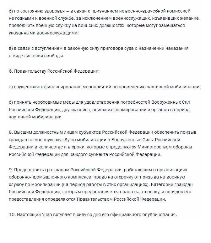 Як заявив путін, призову будуть підлягати тільки громадяни, які перебувають у запасі і насамперед ті, хто проходив службу в лавах збройних сил, мають певні військово-облікові спеціальності та відповідний досвід, перед відправкою в частини вони проходитимуть додаткову військову підготовку з урахуванням досвіду «спецоперації».
