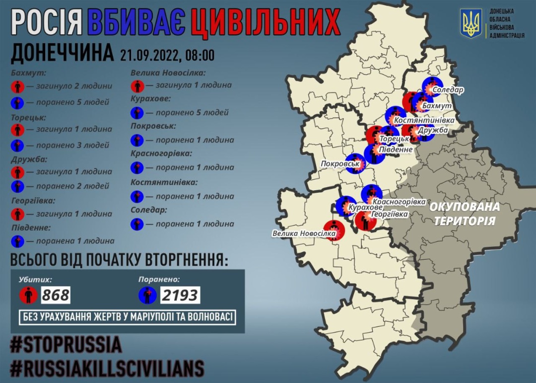 "За 20 вересня росіяни вбили 6 мирних жителів Донеччини: 2 у Бахмуті, 1 у Торецьку, 1 у Дружбі, 1 у Георгіївці та 1 у Великій Новосілці. Ще 20 людей отримали поранення", - написав він.