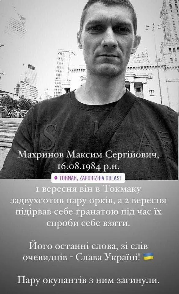 Українець Максим Махринов в окупованому Токмаку на Запоріжжі підірвав себе разом із двома окупантами. Це сталося, коли він у супроводі загарбників виходив із власного під’їзду.