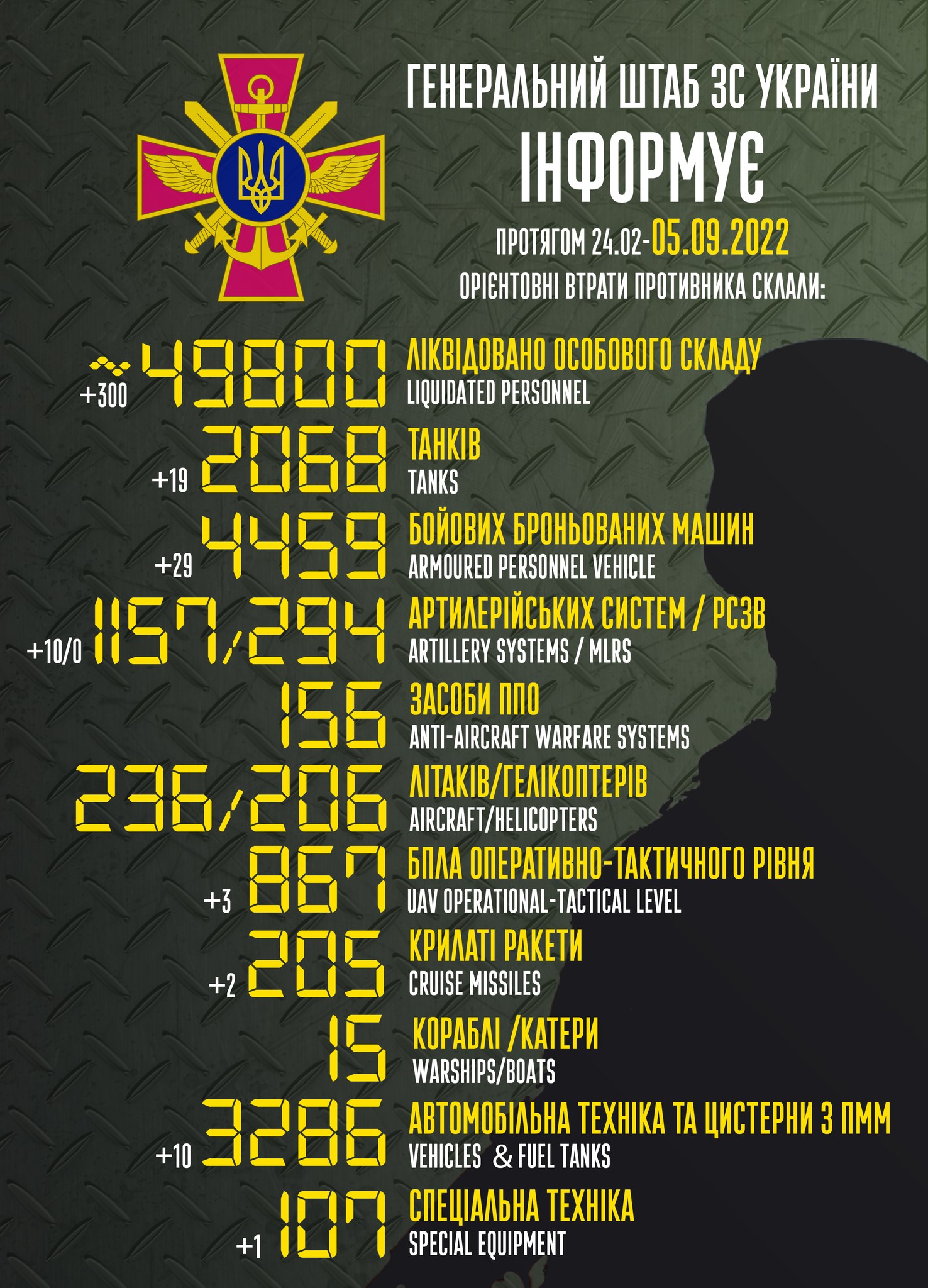 Загальні бойові втрати противника з 24 лютого до 5 вересня орієнтовно сягнули (в дужках – за минулу добу):