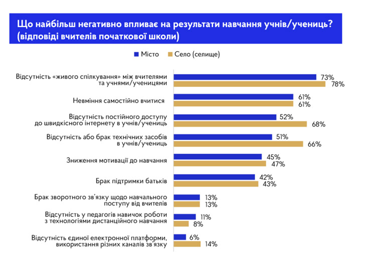 Серед чинників, які негативно впливають на результати, вчителі насамперед називають відсутність "живого спілкування". Також вони вважають проблемою невміння учнів вчитися самостійно.