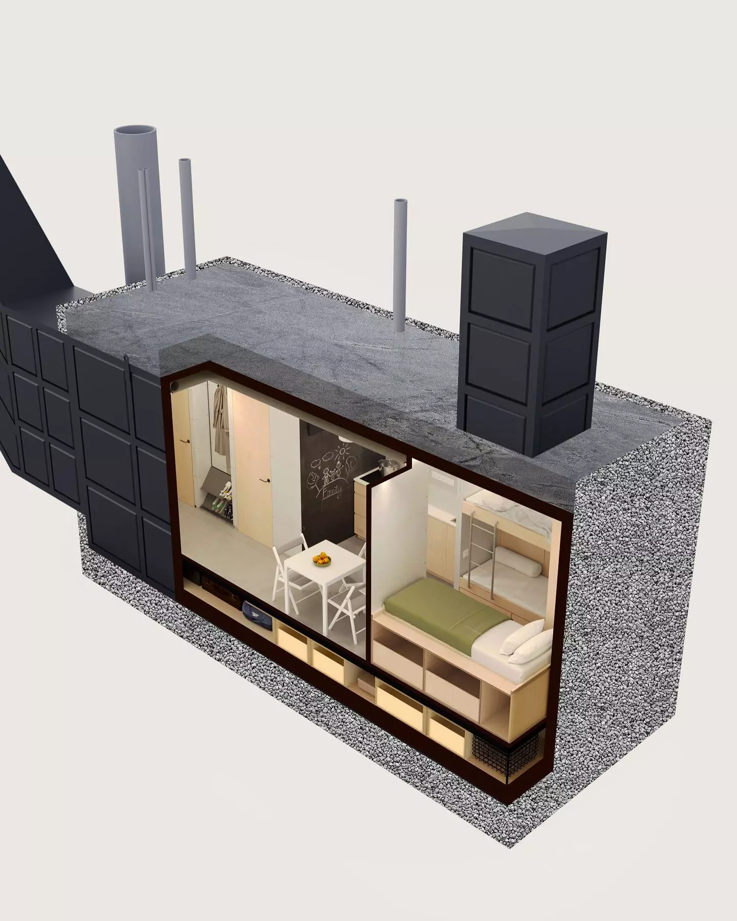 Бункер має два виходи. Резервний вихід розміщується на дажу спальні. Базова комплектація містить ванну кімнату, кухню і спальню для трьох осіб. Бункер під’єднують до мережі водопостачання, каналізації, енергомережі та оснащують системою вентиляції. Металоконструкція має міцне антикоррозійне покриття, утеплене мінеральною ватою.