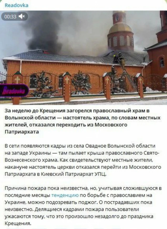 У ворожих ЗМІ 11 січня з’явилося відео про нібито пожежу у Свято-Вознесенському храмі в селі Овадне Володимирського району, однак інформація виявилась фейком.