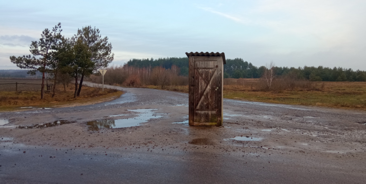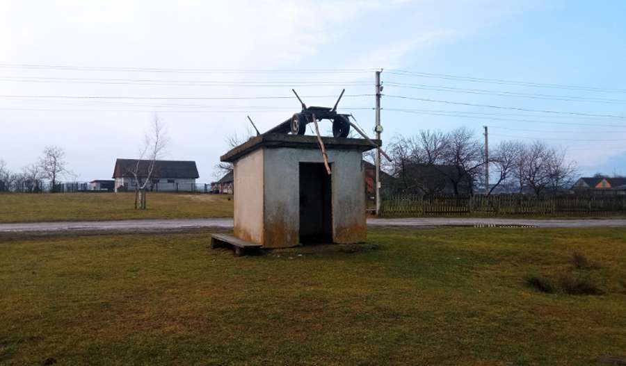 У селі Галина Воля на Старовижівщині жартівники затягнули віз на дах зупинки, а на дорогу випхали дерев’яний туалет.