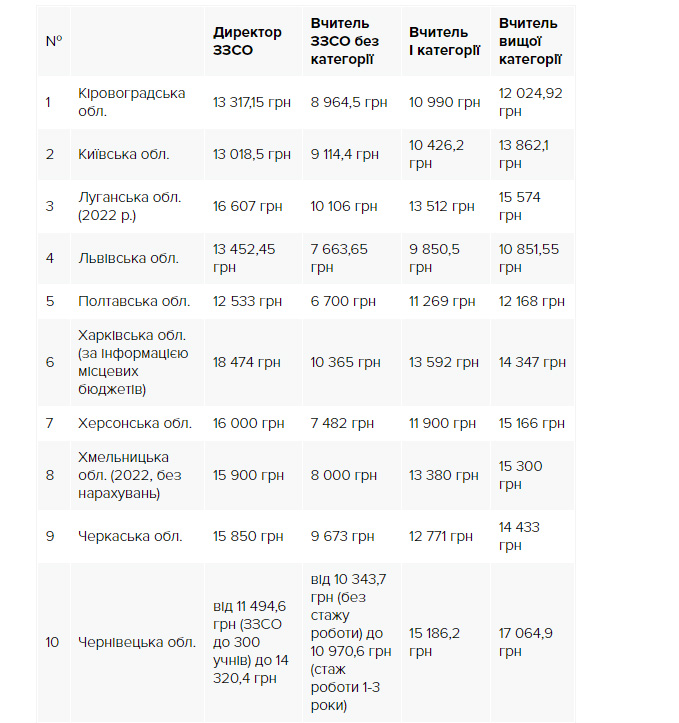У Кіровоградській, Київській та Львівській областях директори шкіл отримують близько 13 тис. грн, а вчителі він 7,6 тис. до 13,8 тис. грн.