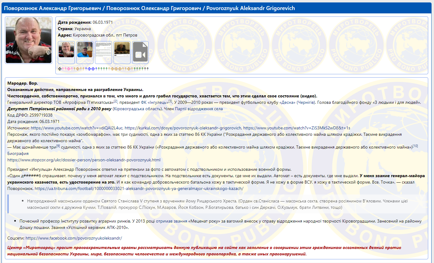Депутат Петрівської райради Кіровоградщини, президент футбольного клубу "Інгулець" та підприємець, який займається аграрним бізнесом Олександр Поворознюк потрапив до бази «Миротворець».
