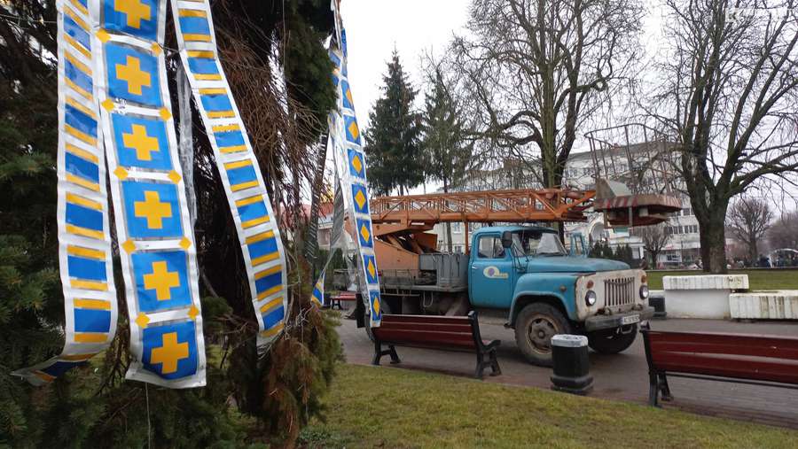 У Луцьку комунальники почали знімати новорічно-різдвяні прикраси з ялинок на Театральному майдані в центрі міста.