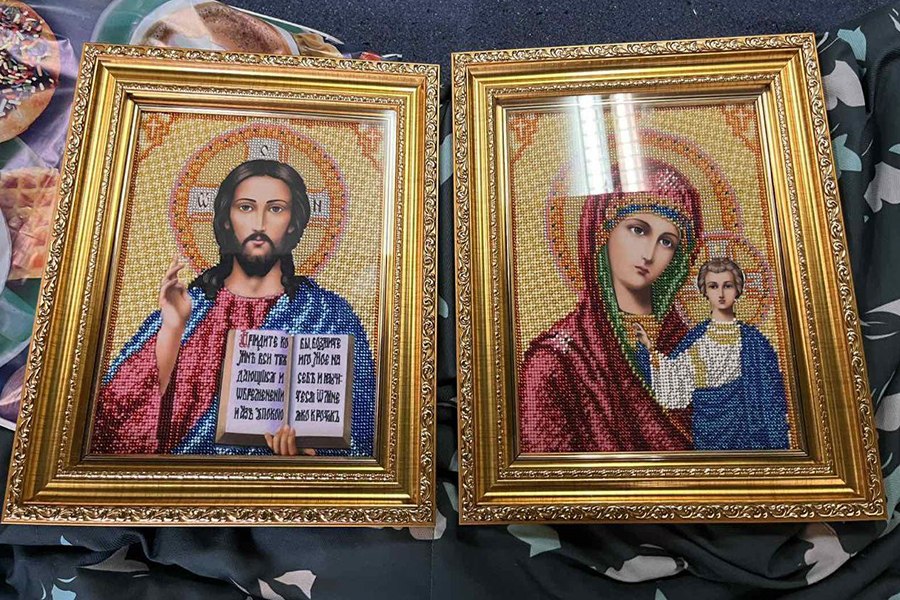 «Першу ікону розміром 40 на 60 сантиметрів вишивав близько місяця. На ній 17 850 намистин бісеру. Зараз, коли маю трохи часу, помалу роблю вінчальні набори ікон. Це Божа Мати з Немовлям і Христос. Один із побратимів уже вінчався з іконами моєї роботи», – говорить гвардієць.