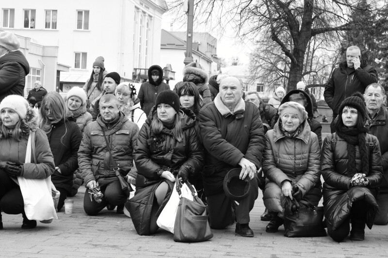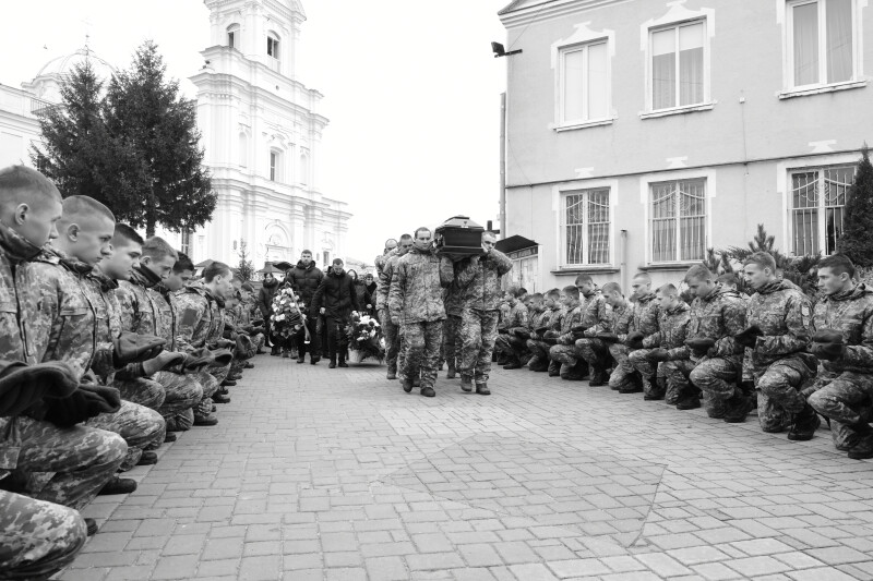 Після богослужіння домовини з тілами Героїв під звуки дзвонів і солдатської сурми пронесли Театральним майданом. Біля фотостенду “Герої Небесної Сотні – Загинули за єдність України” скорботна процесія зупинилася і виконала Державний Гімн.