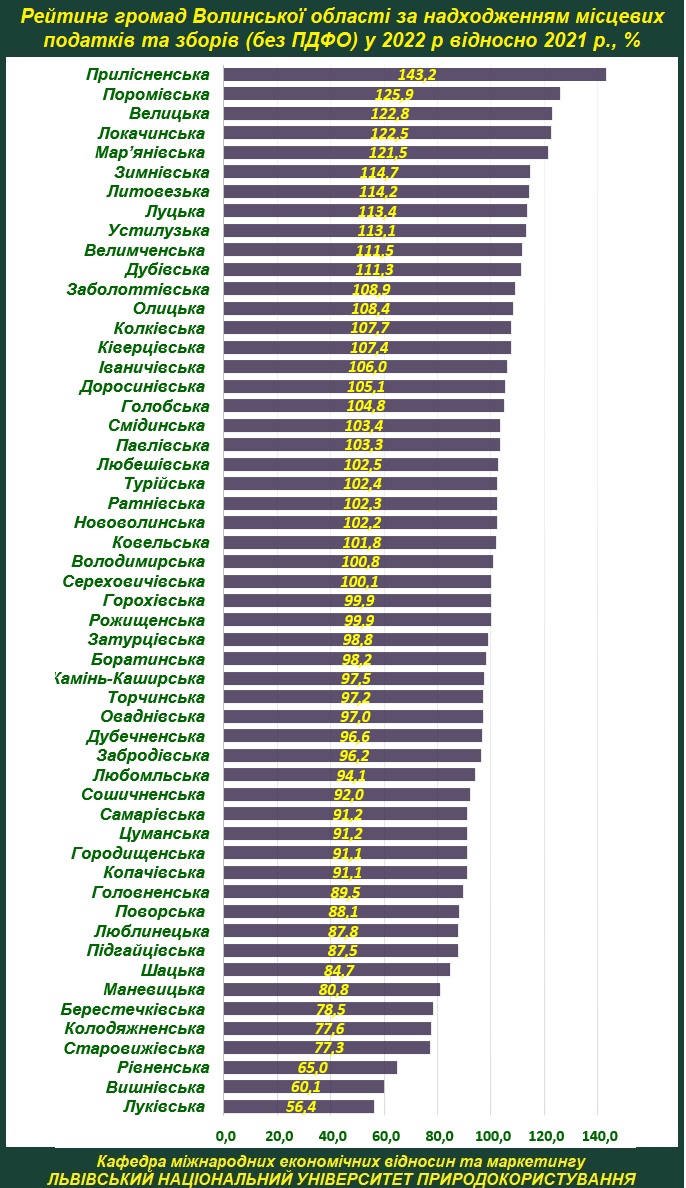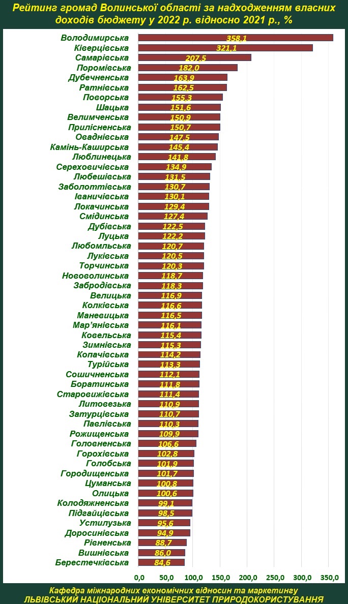 Кафедра міжнародних економічних відносин та маркетингу Львівського національного університету природокористування на основі офіційних даних ДФ Волинської ОДА уклала рейтинг громад Волинської області за показниками власних надходжень бюджету у 2022 році відносно 2021 року.