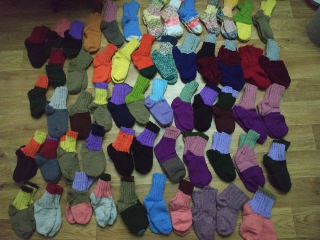Тож тепер, щоб швидше збіг час, згадала давню науку. Розпорює старі речі, щоб були нитки, але більшість внучка Оксана купує. Вже не один десяток пар шкарпеток зв’язала пенсіонерка. Нитки підбирала різнокольорові, щоб вони додавали гарного настрою.