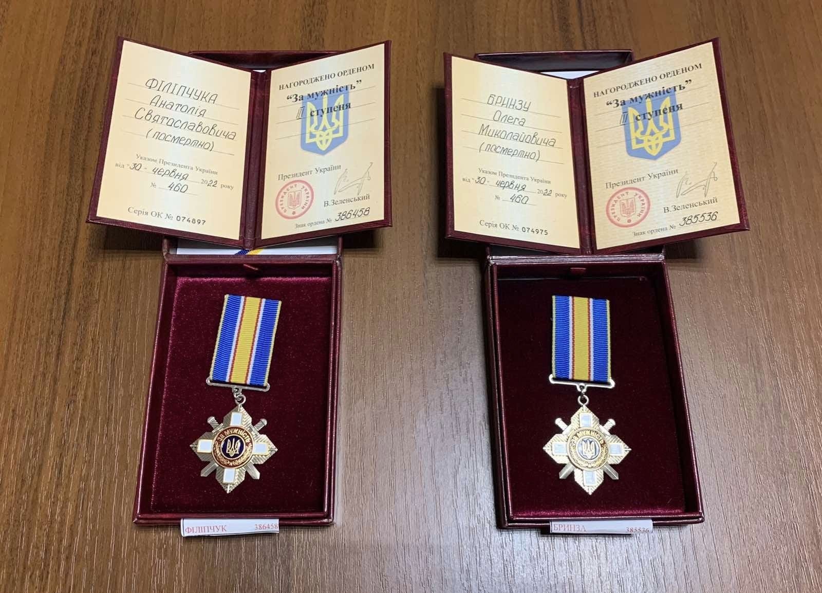 Відповідно до Указу Президента України високу нагороду отримали рідні загиблих військовослужбовців - Олега Бринзи та Анатолiя Фiлiпчука.