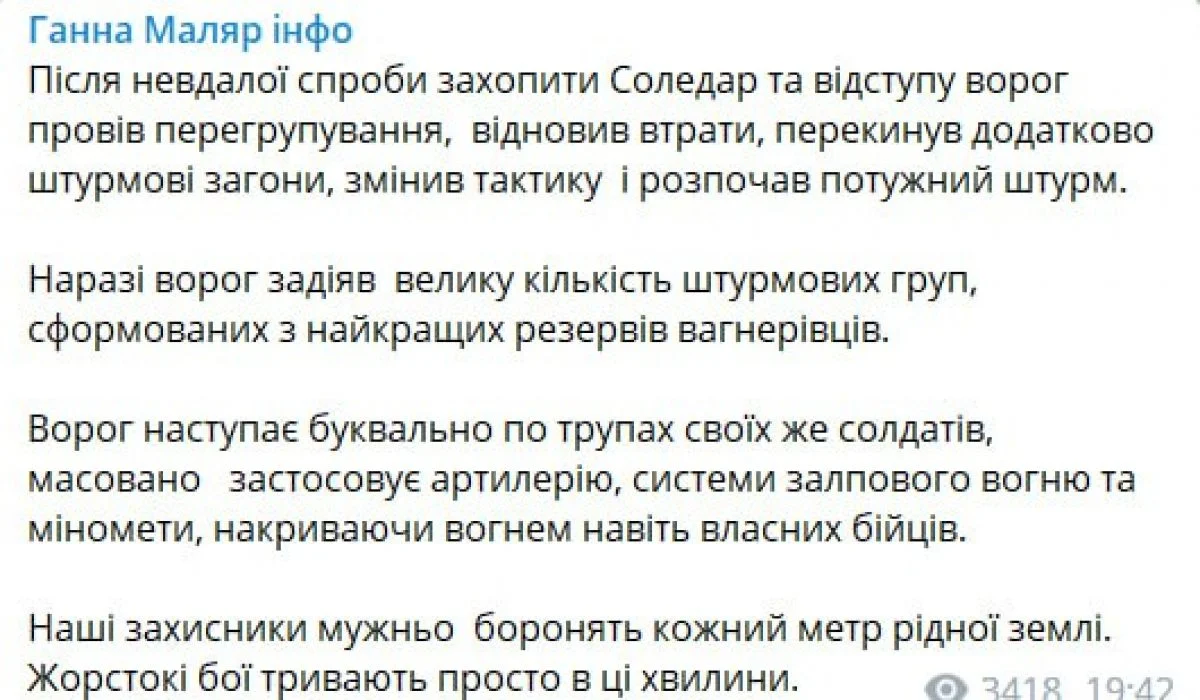 «Після невдалої спроби захопити Соледар і відступу ворог провів перегрупування, відновив втрати, перекинув додатково штурмові загони, змінив тактику і почав потужний штурм», - розповіла Маляр.