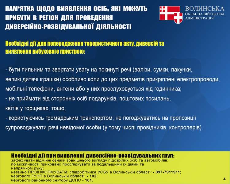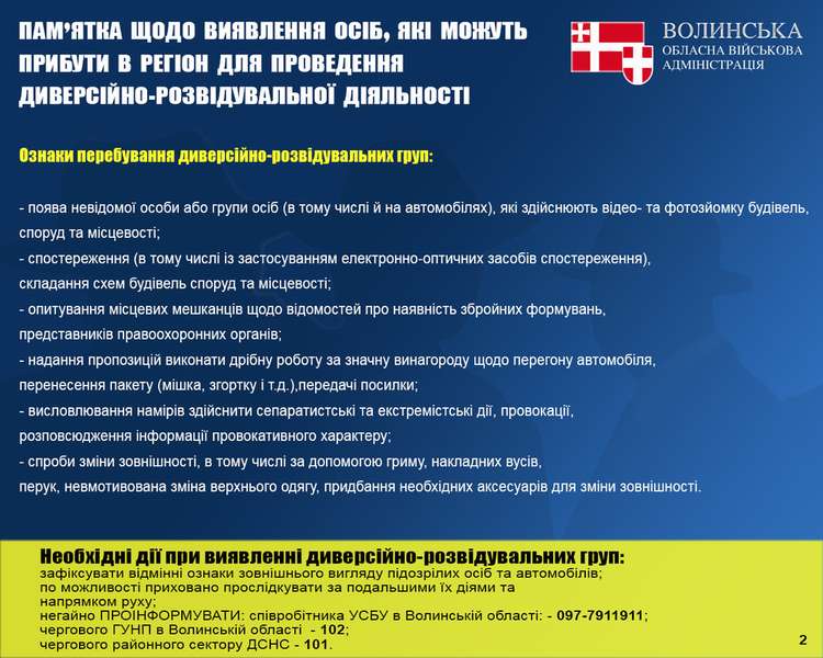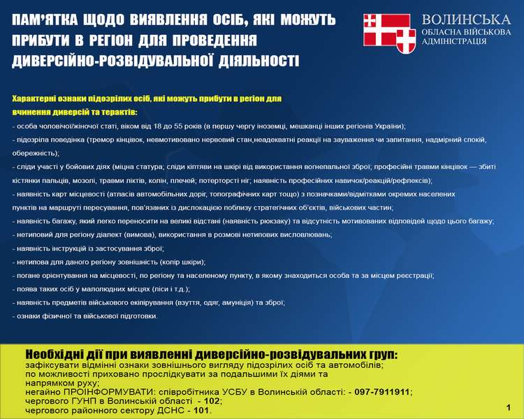 Волинська обласна військова адміністрація опублікувала пам’ятку щодо виявлення осіб, які можуть прибути на Волинь для проведення диверсійно-розвідувальної діяльності.