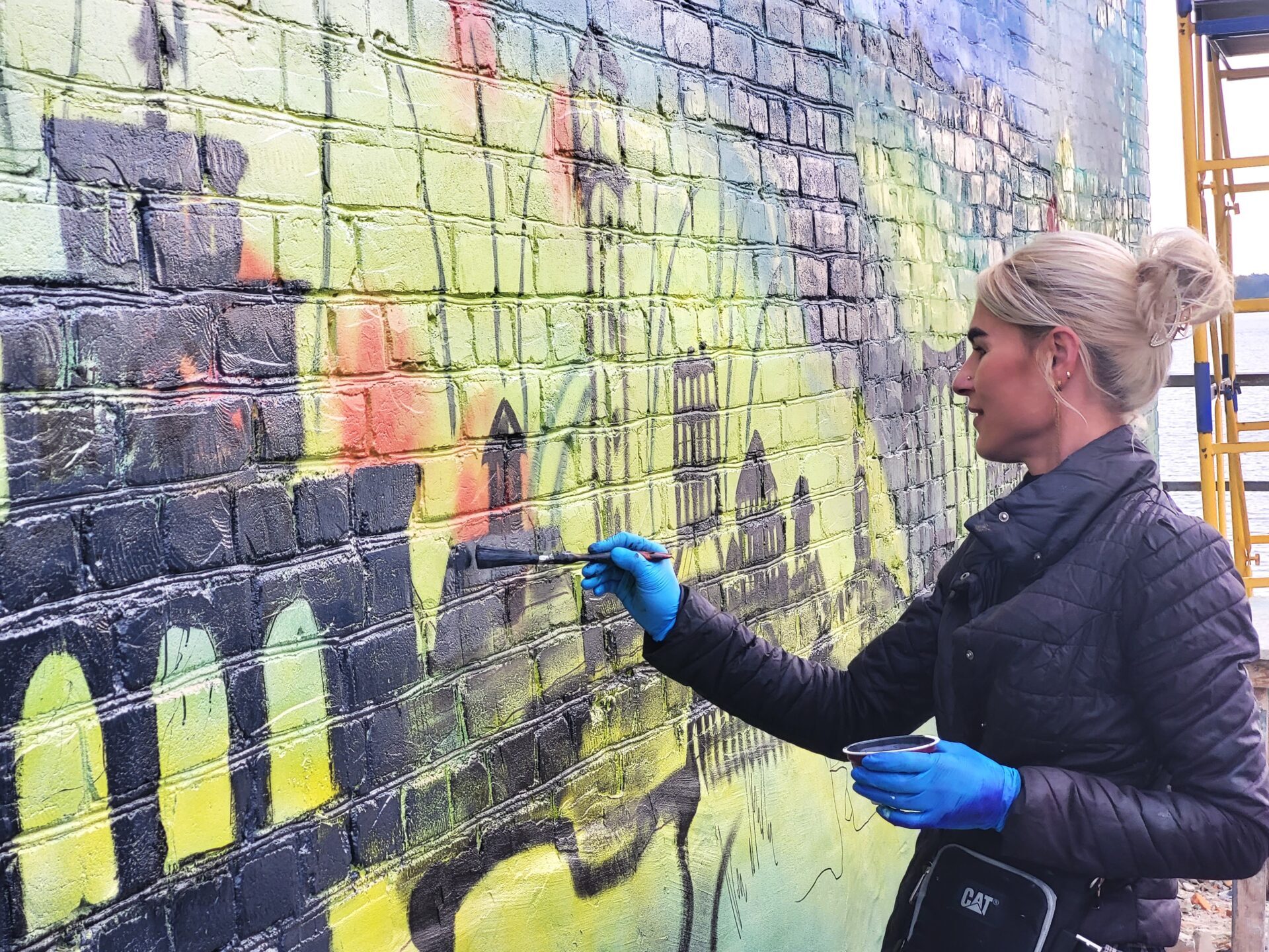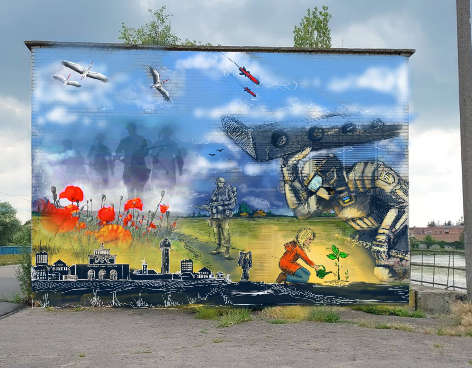 Ескіз для муралу створила Аліна Ткачук. За словами художниці, вони довго працювали над проєктом, аби показати на картині сьогодення.
