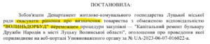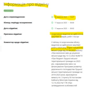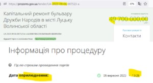 Крок 8. Через кілька хвилин о 12:27 замовник повідомляє про відміну всієї закупівлі через скорочення видатків на ремонт бульвару Дружби народів. Відповідне рішення прийняла Луцька міськрада 30 серпня, тобто через день після того, яка АМКУ наказав гнати «Волиньдорбуд».