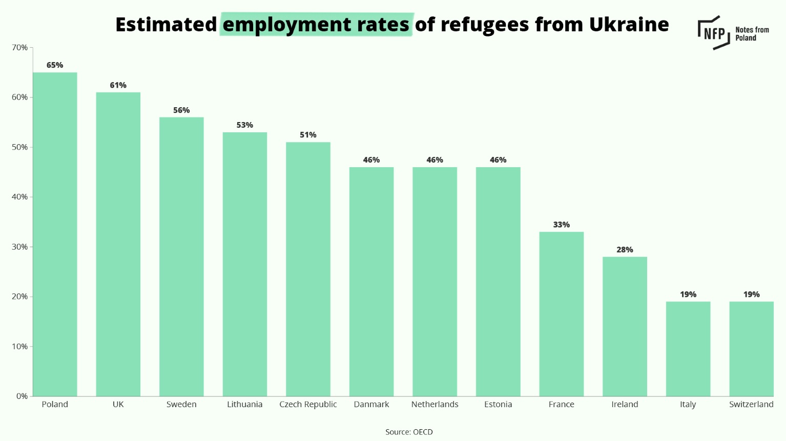 У звіті ОЕСР зібрані дані 12 із 38 країн, що входять до організації. Зазначається, що найбільше працевлаштованих біженців працездатного віку у Польщі (65%). На другому місці Британія (61%), а на третьому – Швеція (56%).