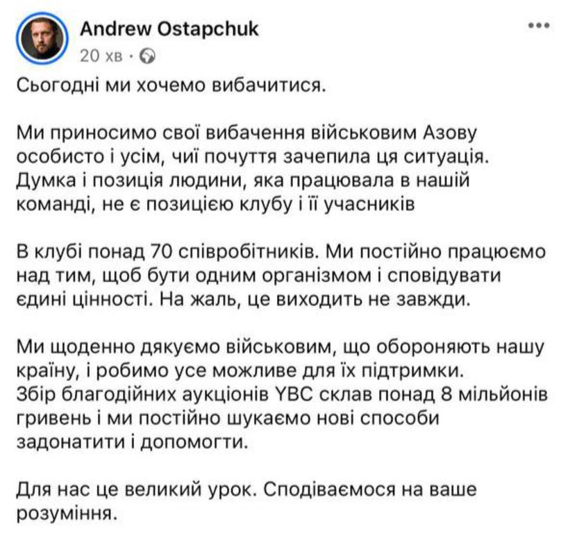 Згодом після коментаря керівниці Патронатної служби «Азову» український підприємець, Андрій Остапчук вибачився перед військовими «Азову» й тими, чиї почуття зачепила ця ситуація.