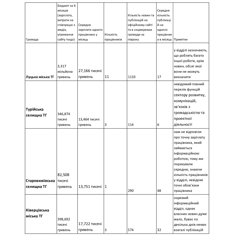 Зовсім інше можна сказати, наприклад, про Луцьку міську ТГ, де на зарплати працівників за півроку виділили майже 1,8 мільйона гривень, а на співпрацю з медіа — витратили майже 1,5 мільйона гривень. Якщо проаналізувати наповнення сайту Луцької міської громади із іншими громадами, то кошти на це виділяють найбільші, а за кількістю опублікованих новин за місяць громада лідером не є.