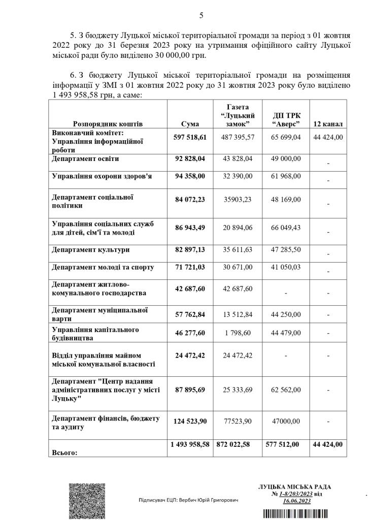 Також з бюджету Луцької міської територіальної громади на розміщення інформації у медіа за півроку виділили майже 1,5 мільйона гривень.