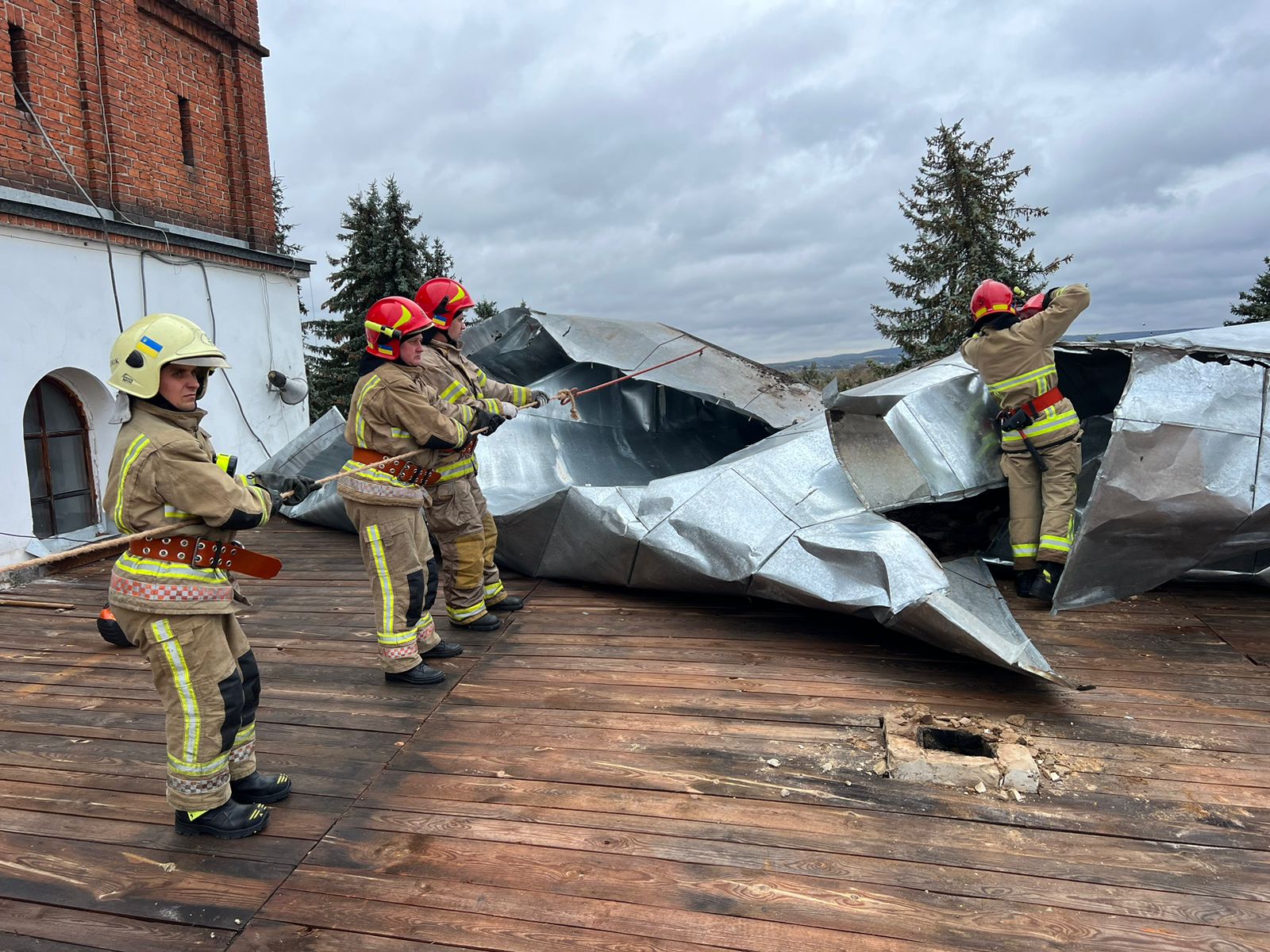 «Сьогодні дубенські рятувальники за допомогою спеціального обладнання зняли аварійні елементи даху Державного історико-культурного заповідника (Дубенський замок) на площі 200 м2, що були пошкоджені внаслідок сильного вітру та безпечно опустили їх на землю», – йдеться в повідомленні.