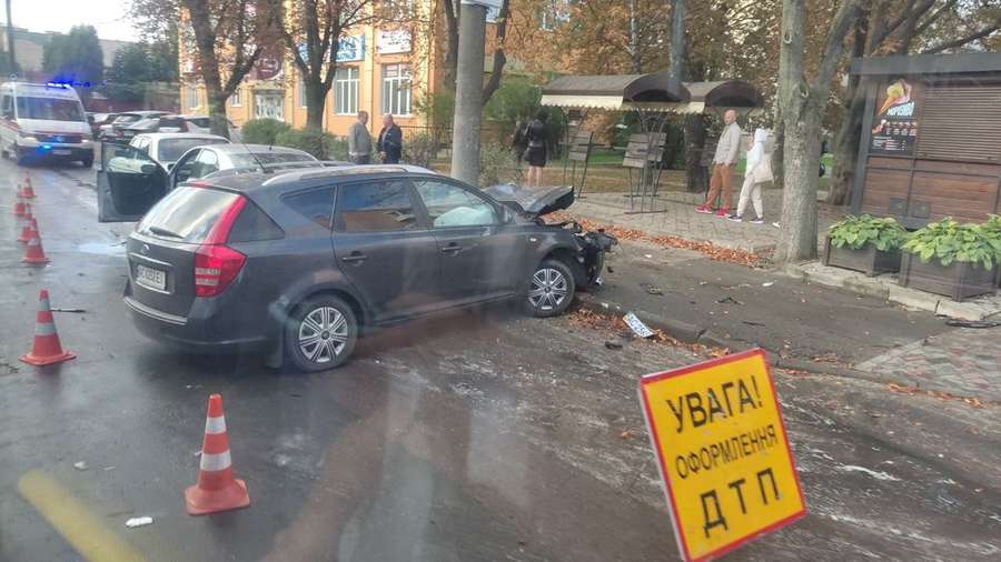 На проспекті Відродження, у Луцьку поблизу ліцею №18 вранці 6 жовтня сталася аварія. Зіштовхнулись автівки, на місці ДТП працює «швидка».