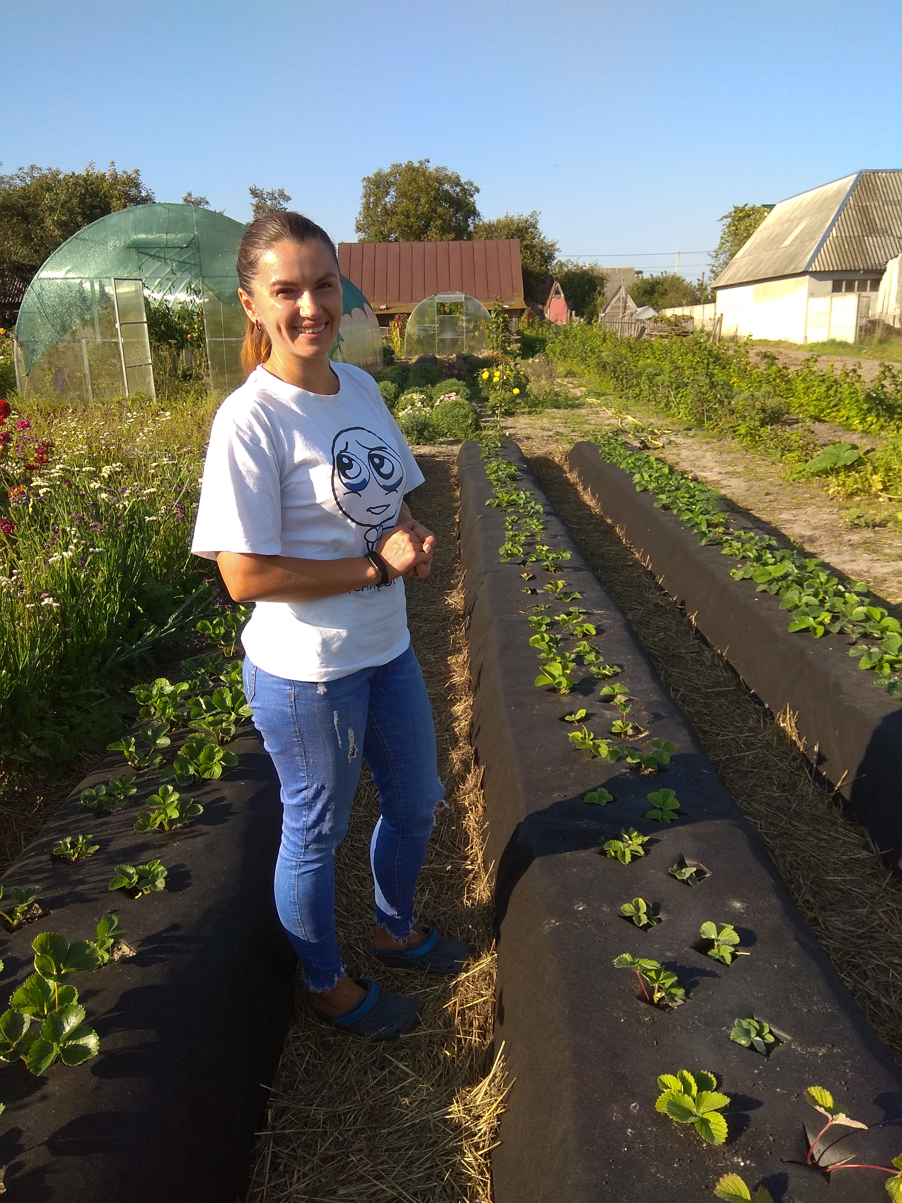 Близько чотирьох сотень кущиків висадила господиня полуниці. Спробувала новий спосіб — у валки під агроспам. Обрала такий спосіб для кращого провітрювання. І також працює з різними сортами. Поряд зі звичними червоними ягодами вирощує білі полунички сорту «Ананаска».