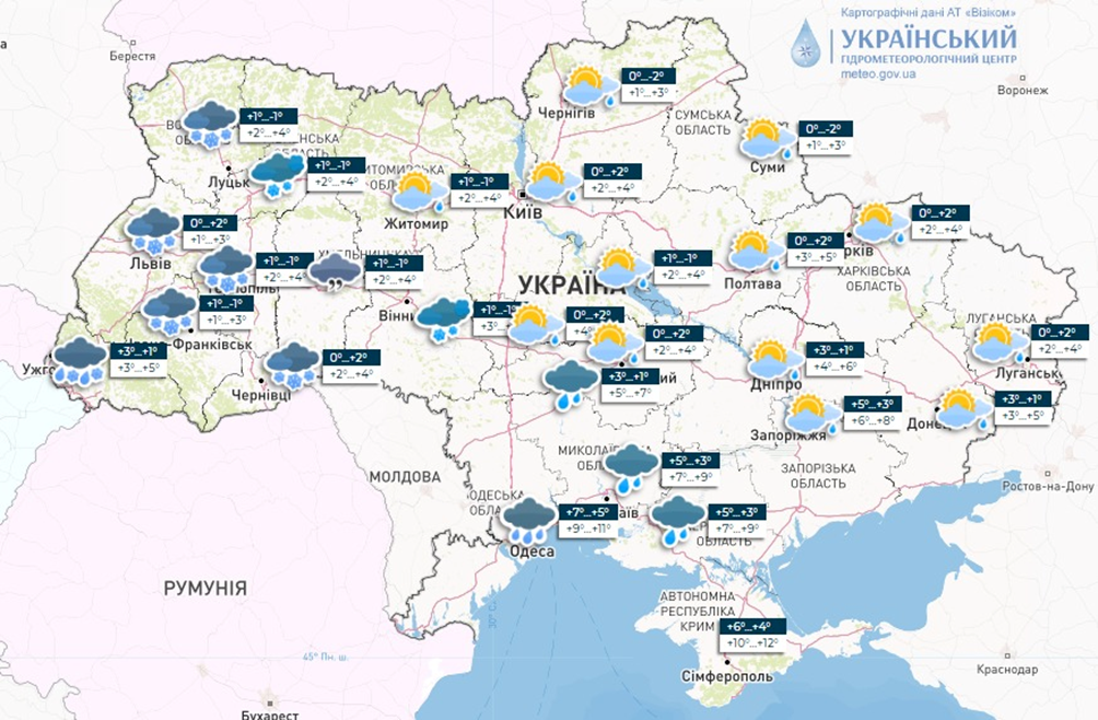 Температура повітря вночі переважно коливатиметься від 2° морозу до 3° тепла. Протягом дня в більшості областей становитиме 0-5°. У південних областях вночі очікується 1-6° тепла, а вдень – 5-10°. На півдні Одещини та в Криму температура сягатиме 13°. У Карпатах вночі та вдень очікується 1-6° морозу.