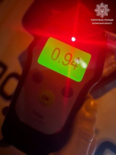 Патрульні виявили у молодого чоловіка ознаки алкогольного сп’яніння. Йому запропонували пройти огляд за допомогою приладу Drager, і алкотестер показав результат 0,94 проміле. Фото: патрульна поліція Волинської області.