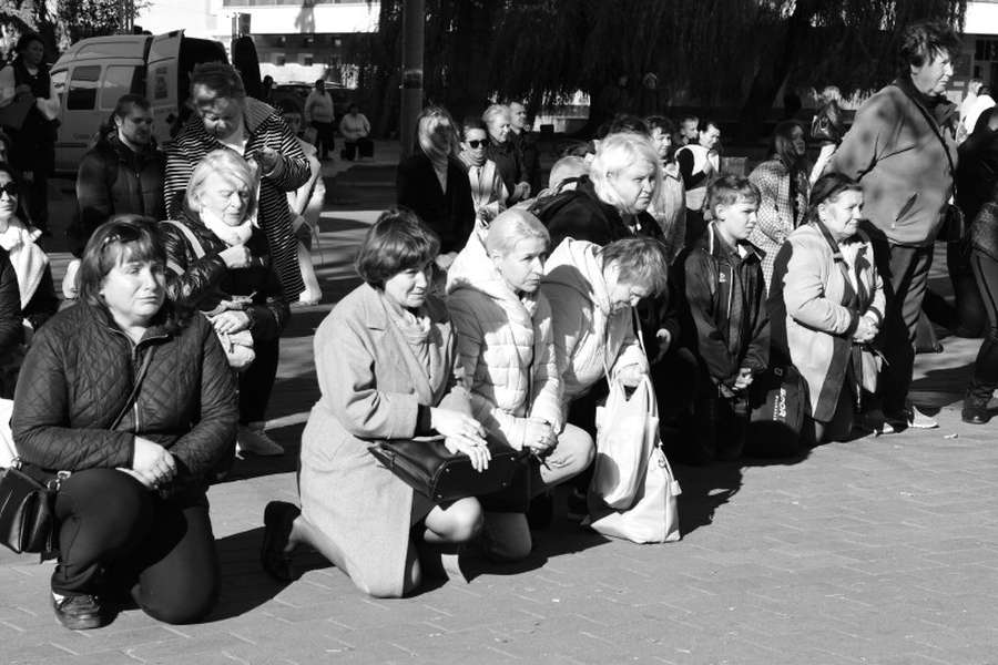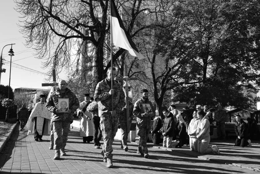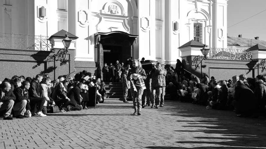 Після завершення панахиди домовини з тілами воїнів прощальною ходою пронесли Театральним майданом. Біля фотостенда »Герої Небесної Сотні – Загинули за єдність України» скорботна процесія зупинилася і виконала Державний Гімн.