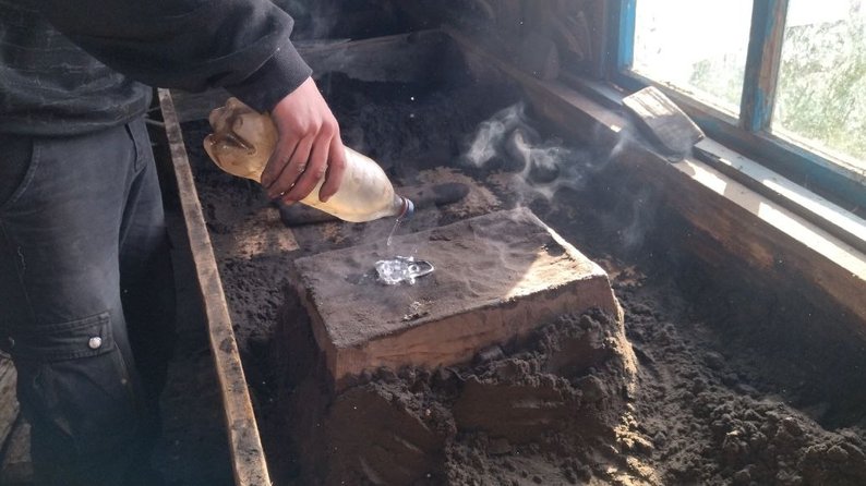 Поки розтоплюється метал у печі, Микола готує форму, в яку його виливатиме. Каже: це найкропіткіша частина процесу. Для цього використовує дві дерев'яні рамки та попередньо зволожений водою пісок.
