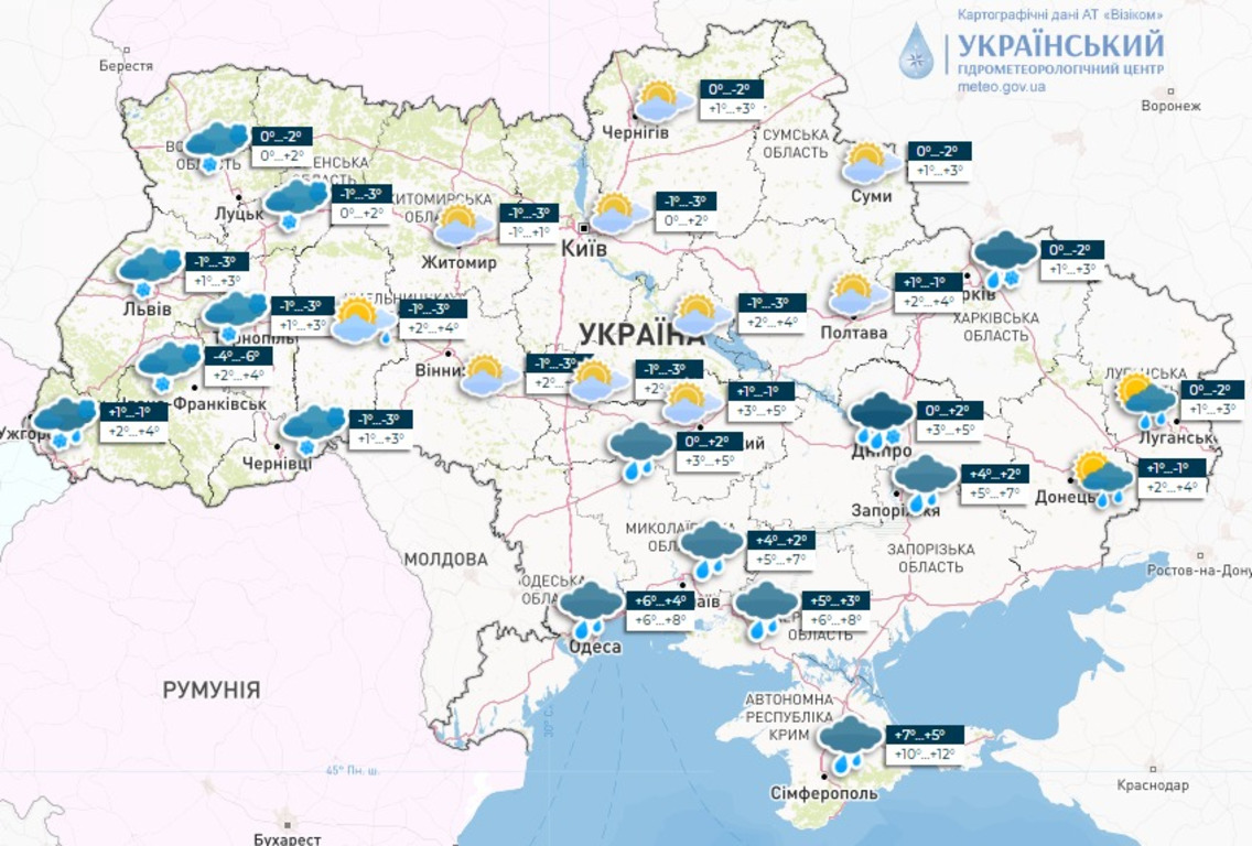 Температура повітря в Україні коливатиметься від 3° морозу до 2° тепла. Удень у центрі та на сході країни очікується прогрів до +1-6°. У південних областях буде тепліше: вночі +1-6°, а вдень +4-9°.