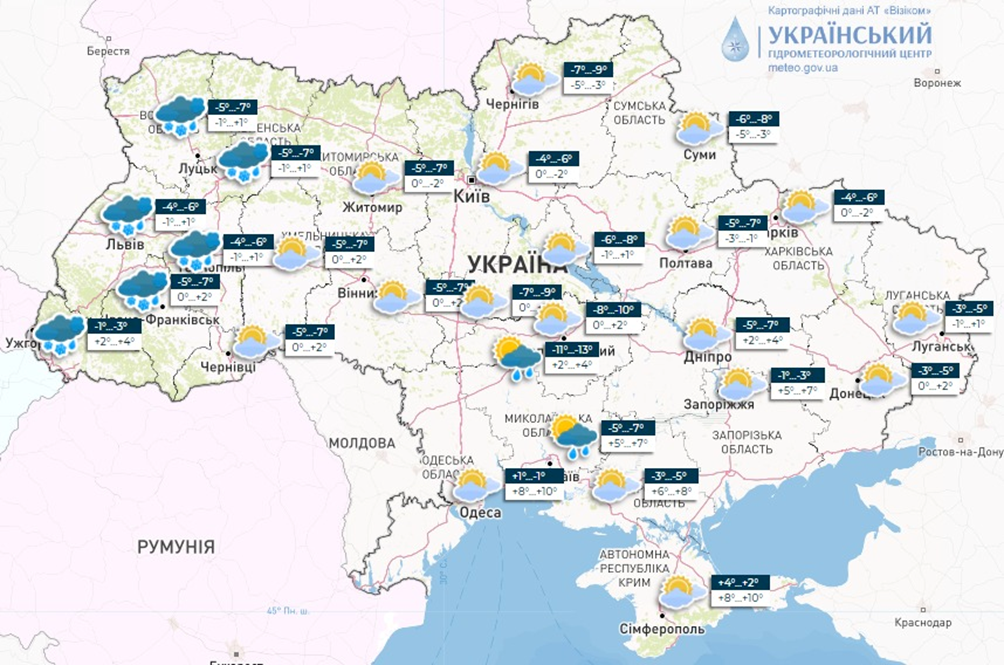 Температура повітря вночі переважно становитиме 5-10° морозу. На Закарпатті, півдні Одещини та південному сході країни очікується від 0 до 5° морозу, а в Криму від 0 до 5° тепла. Протягом дня в більшості областей коливатиметься від 3° морозу до 2° тепла. На півдні передбачається 3-8° тепла, в Криму до 11°.
