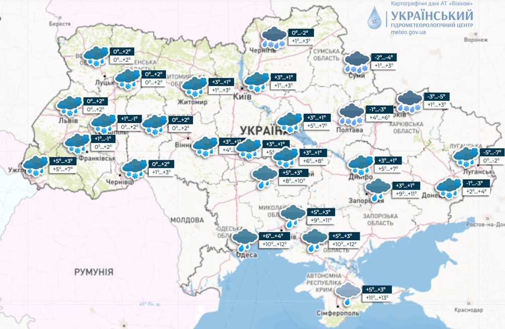 В Україні буде хмарно. Очікується помірний мокрий сніг та дощ, місцями ожеледь, налипання мокрого снігу. На півдні переважно дощі. Уночі в Карпатах та на Закарпатті, вдень у Чернігівській, Полтавській, Сумській та Харківській областях будуть значні опади.