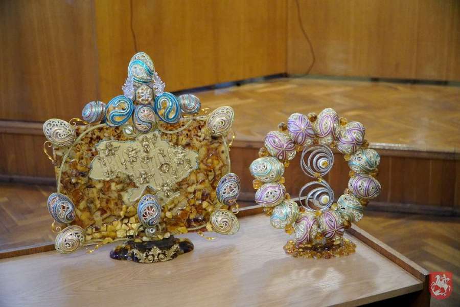 Волинський Фаберже презентував кілька своїх нових виняткових робіт з різьбленої та кованої металом яєчної шкаралупи, одна з яких – бурштинове панно із зображенням карти України.