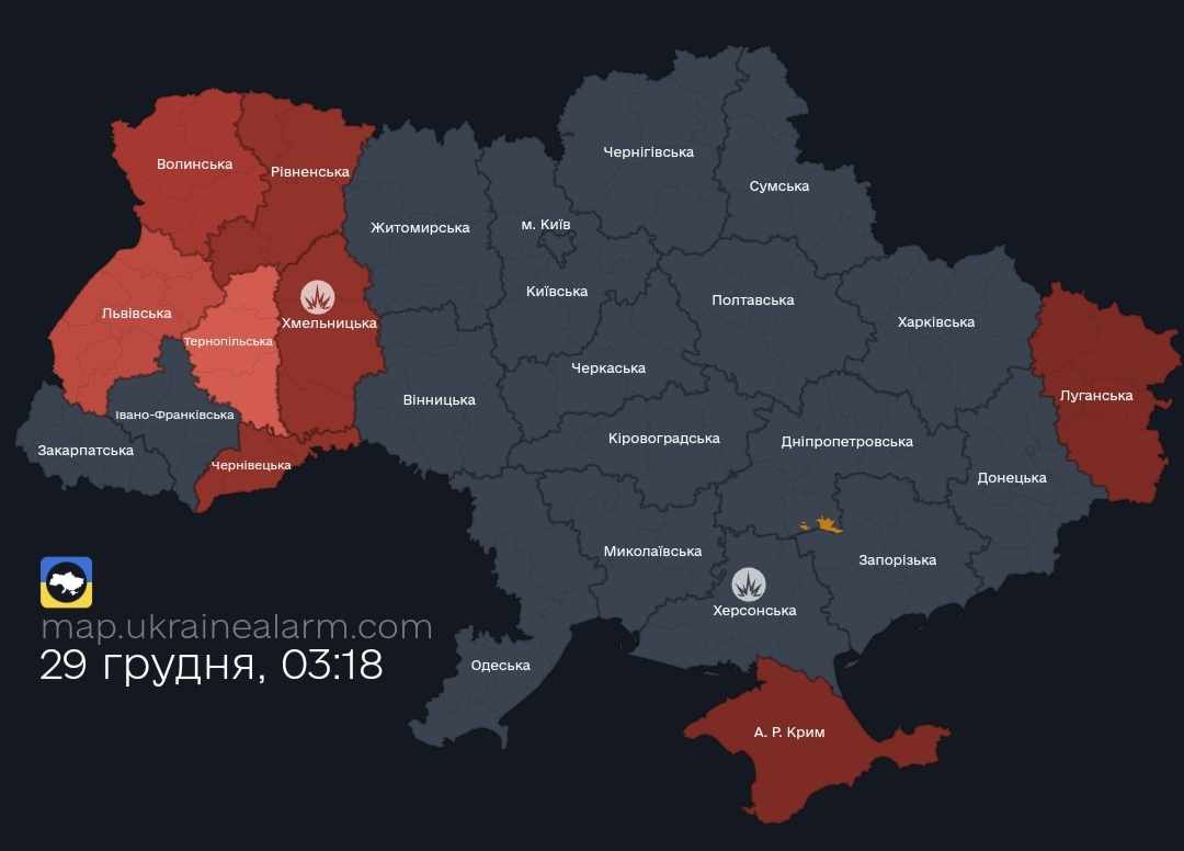 Повітряна тривога через атаку безпілотників також оголошена у Рівненській, Волинській, Хмельницькій, Тернопільській, Львівській та Чернівецькій областях.