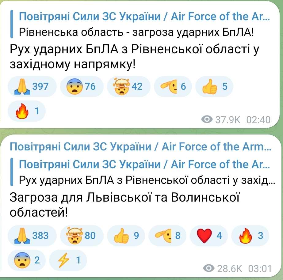 "Рух ударних БпЛА з Рівненської області у західному напрямку! Загроза для Львівської та Волинської областей!" - повідомили на телеграм-каналі Повітряні сили ЗСУ.