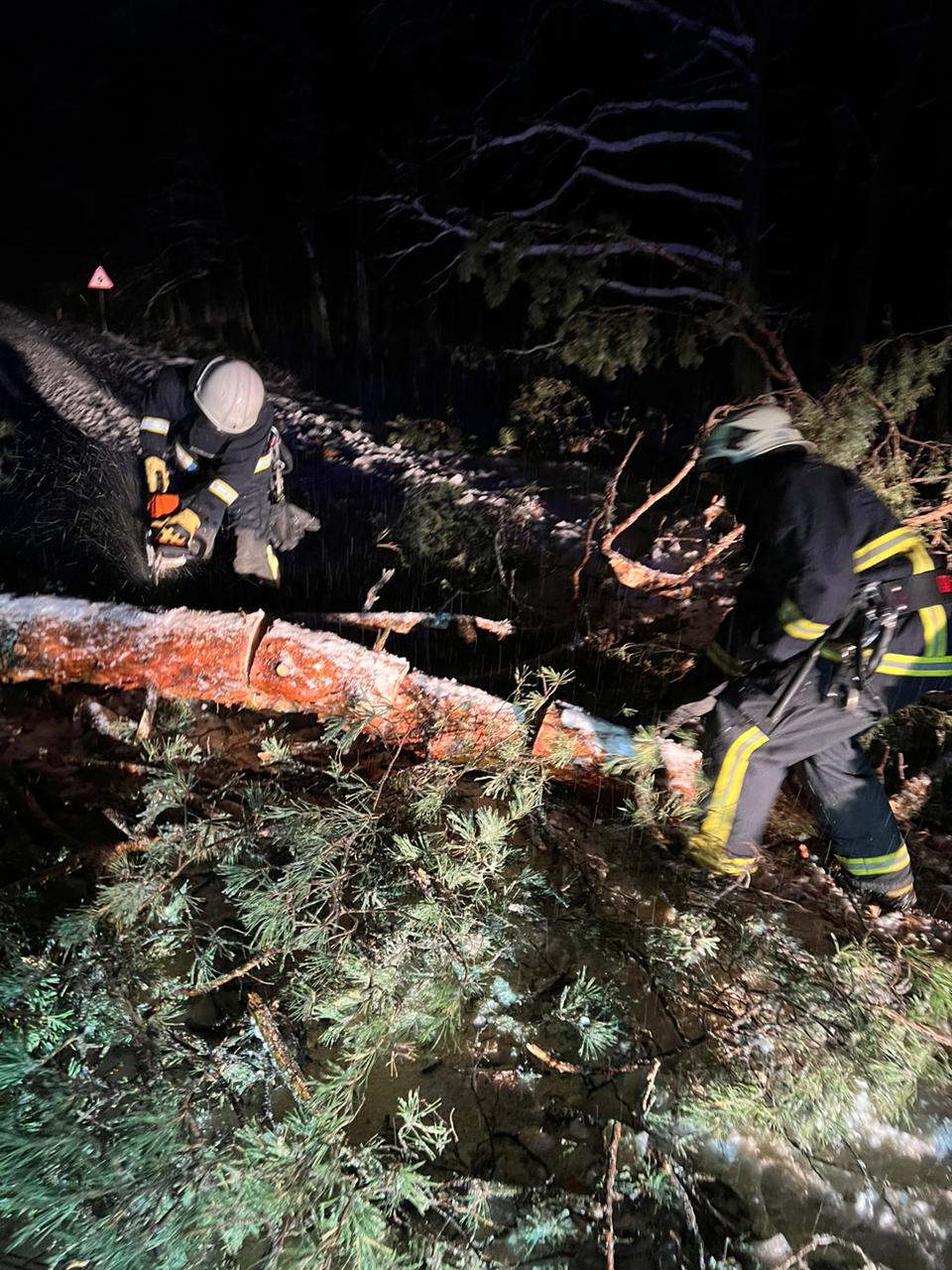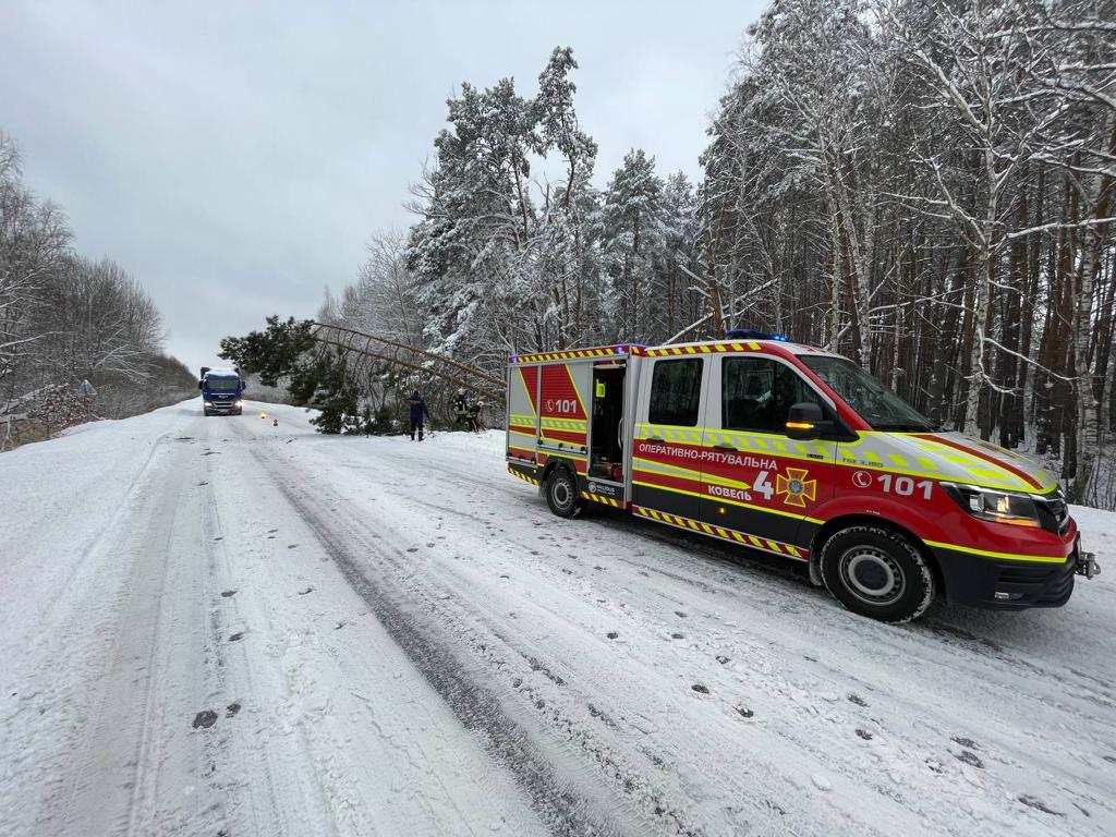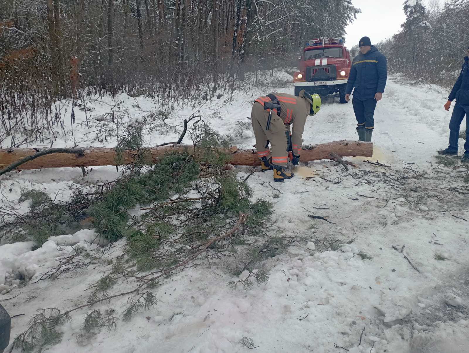 Через хуртовини та сильний вітер повалені дерева перегородили рух транспорту на дорогах біля сіл Веснянка, Ольганівка, Жабка Луцького району. Працівники служби 101 за допомогою спеціального обладнання розчистили заблоковані дороги.
