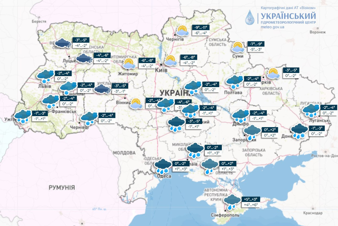У південних, центральних та Донецькій областях очікуються сніг і дощі. На Закарпатті та Прикарпатті прогнозується сніг. У решті областей опадів практично не передбачається.