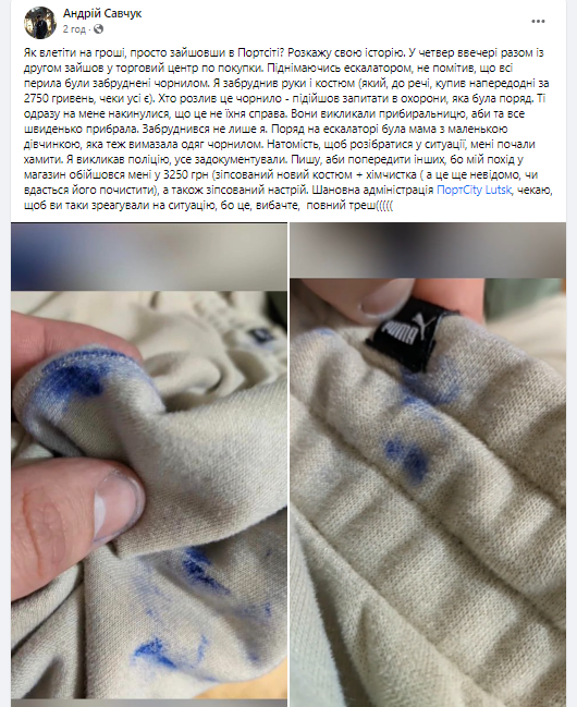 «Вони відразу на мене накинулися, що це не їхня справа. Викликали прибиральницю, аби та все швиденько прибрала. Замість того, щоб розібратися у ситуації, мені почали хамити. Я викликав поліцію, усе задокументували. Пишу, аби попередити інших, бо мій похід у магазин обійшовся мені у 3250 грн (зіпсований новий костюм + хімчистка (а це ще невідомо, чи вдасться його почистити), а також зіпсований настрій. Шановна адміністрація ПортCity Lutsk, чекаю, щоб ви таки зреагували на ситуацію, бо це, вибачте, повний треш», - пише чоловік.