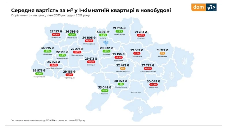 Найвища середня ціна за м² в 1-кімнатній квартирі фіксується у Києві – 48 871 грн. Цікаво, що у січні в порівнянні до грудня ціна має мінімальний спад – на 0,2%, в грудні вартість була 48 947 грн. А якщо порівнювати вартість у січні 2023 року із січнем 2022 року, то бачимо цього року ріст ціни на 39%.