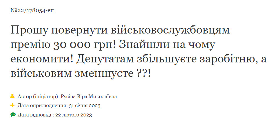 У відповіді на петицію президент нагадав, що Кабмін затвердив постанову про виплату військовослужбовцям по 100 000 грн або 30 000 грн на місяць 28 лютого 2022 року.