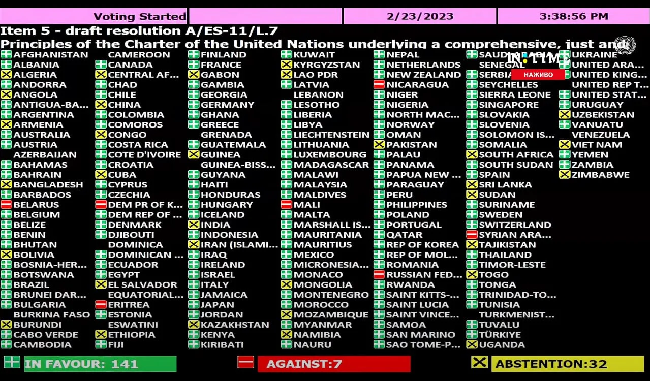 Водночас 94 країни ООН Генасамблеї ООН проголосували проти поправок Білорусі, які передбачали заклик до мирних переговорів між Україною та Росії без попередніх умов. Підтримали 11 держав, а 56 – утримались.